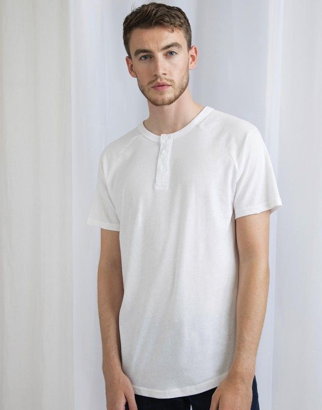 · 150 g / m² · 100% algodão (certificado GOTS, orgânico) · Toque pêssego · Gola com fita · Mangas raglan · Gola redonda. Carcela com três botões na mesma cor · Costura dupla na bainha da manga · Bainha arredondada · Etiqueta removível